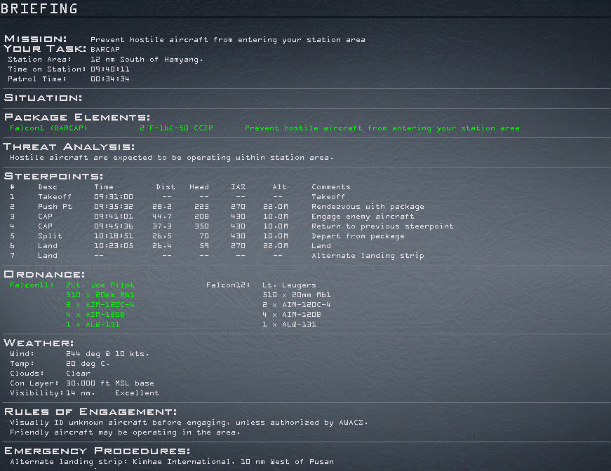 Unsere Bodentruppen haben in den frühen Morgenstunden den Vormarsch in Richtung Yechong aufgenommen. Zum Schutz gegen einfliegenden feindlichen Maschinen fliegen Sie Barcap entlang der Flot. Feindliche Maschinen aus Nord bzw. Nord- West sind nur anzugreifen, wenn diese versuchen in unseren Luftraum einzudringen.