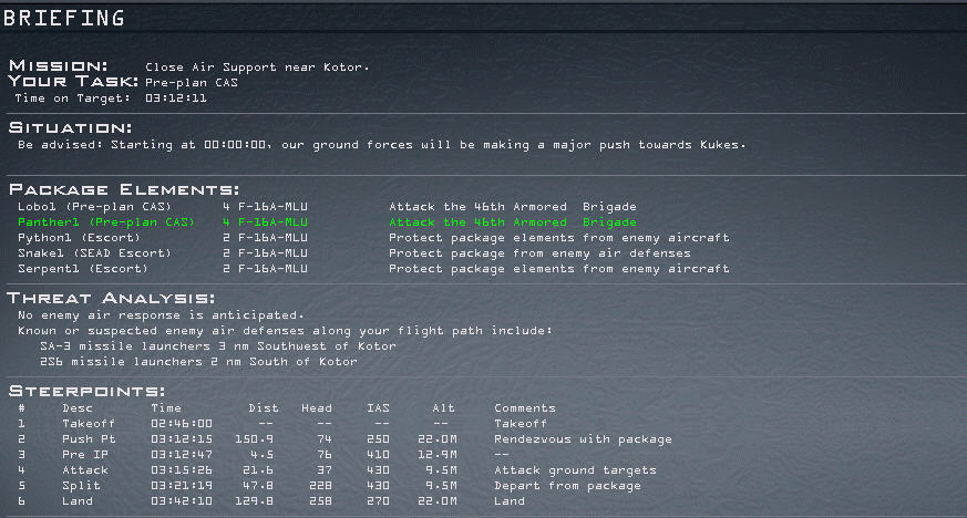 Wir werden im heutigen Einsatz damit beginnen die Bodentruppen an der Küste zu bekämpfen. Dazu fliegen jeweils zwei Fourship F-16A-MLU Angriffe auf das 4th sowie 3rd Tank Battalion, die zur 46th und 47th Armored Brigade gehören. Begleitet werden sie von jeweils zwei Twoship Escort F-16A-MLU und einem Twoship Sead- Escort F-16A-MLU.