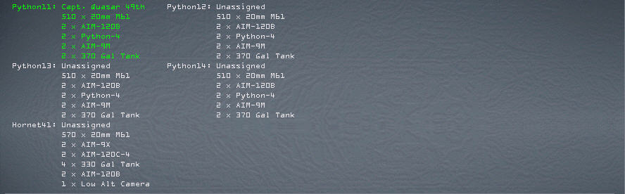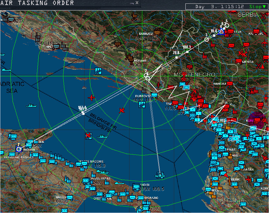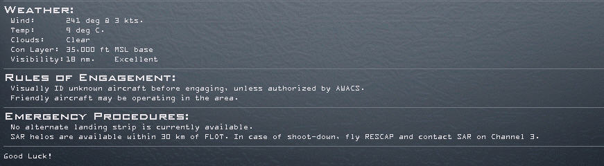 Zum Schutz der Bomber haben wir einen Four- Ship Escort. Wir rechnen mit keiner großen Boden – Luft Abwehr weswegen wir heute auf einen Sead- Escort verzichten. Eine FA-18F wird nach erfolgtem Bombenangriff ein Aufklärungsflug über Lepa- Glava fliegen und die Zerstörungen aufnehmen. Der Hornet- Flight wird etwas früher am Push sein, deshalb wird er hier ein Holding drehen bis der gesamte Bomber Flight incl. Escorte vorbei geflogen ist und sich diesen anschließen. Gentleman ich wünsche Ihnen viel Glück, auf das Lepa- Glava Geschichte wird. ;-)