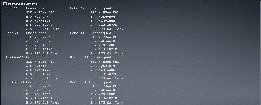 Im heutigen Einsatz fliegen Sie ein OCA- Strike auf die Lepa- Glava Airbase. Dieser Strike wird mit acht Bombern geflogen, da wir sicher gehen wollen, dass Lepa Glava längere Zeit einsatzunfähig bleibt. Wir haben hier insgesamt 22 Ziele. Diese Ziele entnehmen sie bitte in Main Briefing und teilen diese auf die jeweiligen Bomber Flights Lobo1 und Panther1 auf.